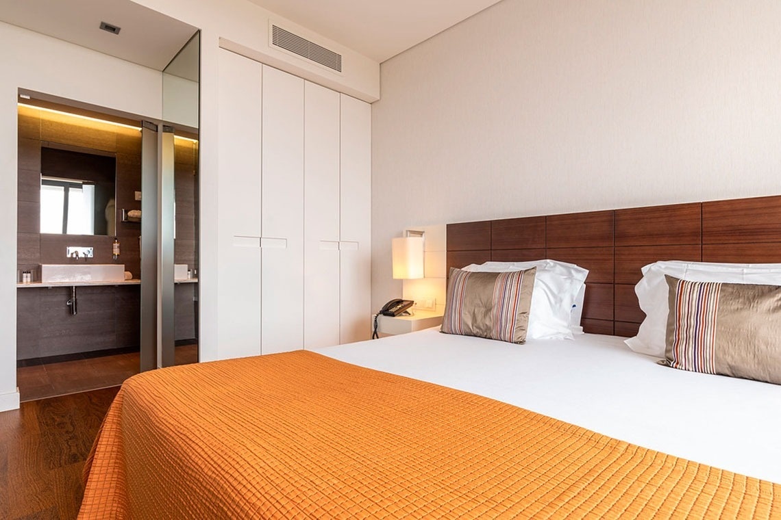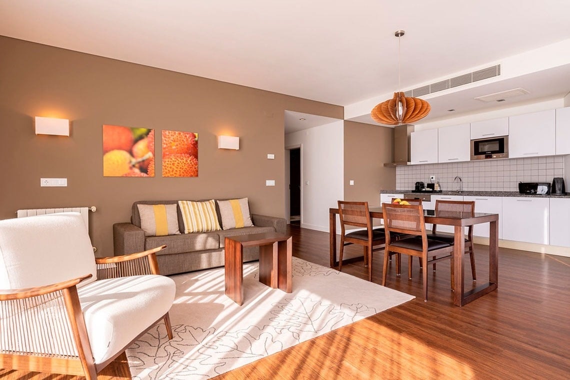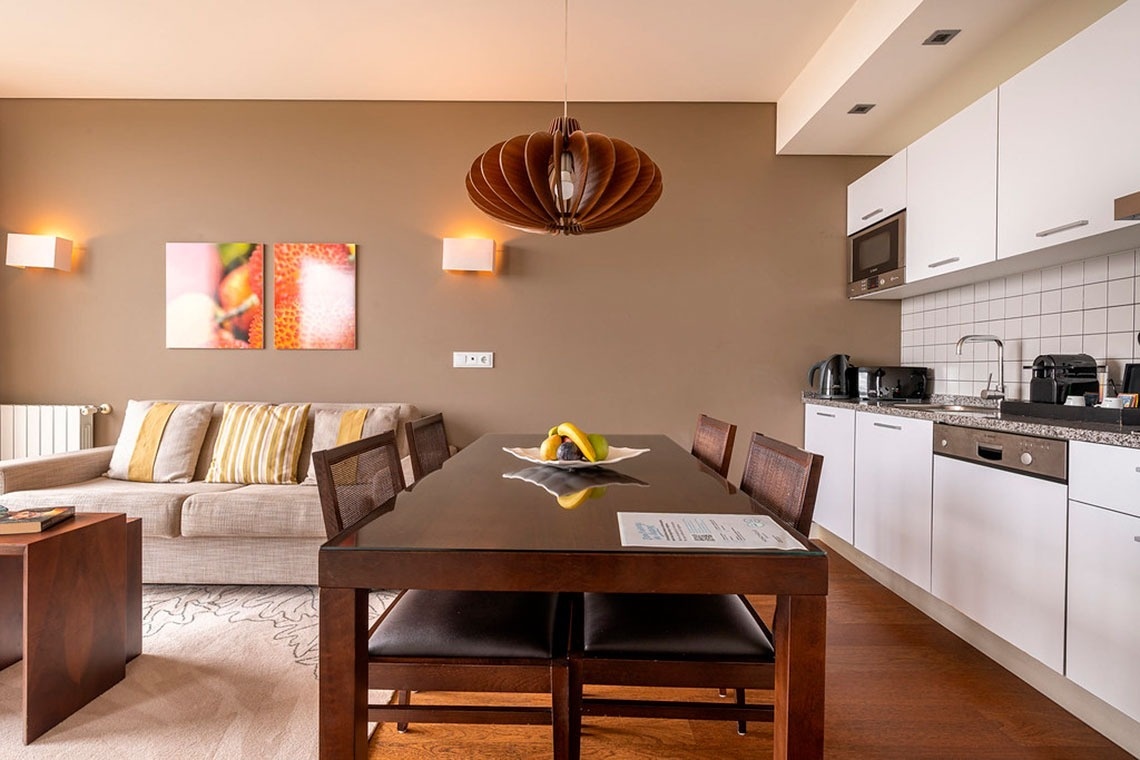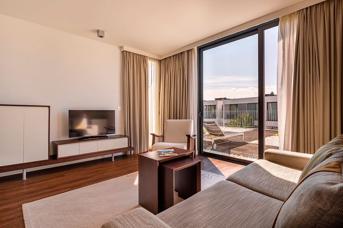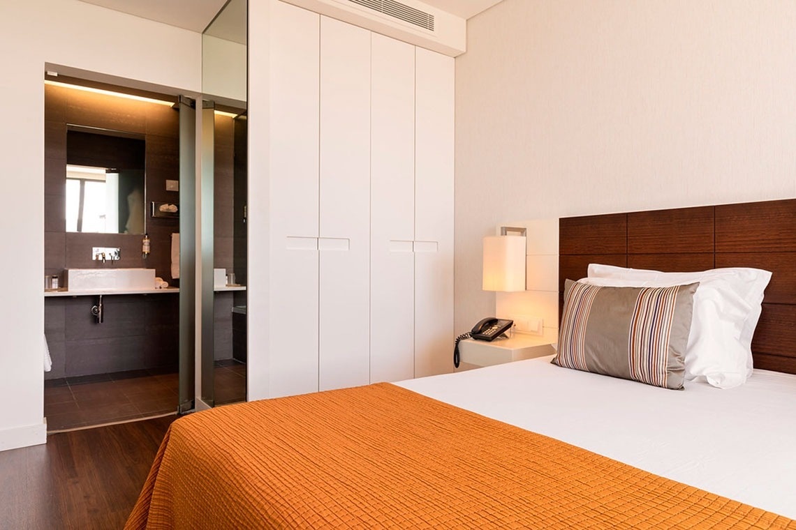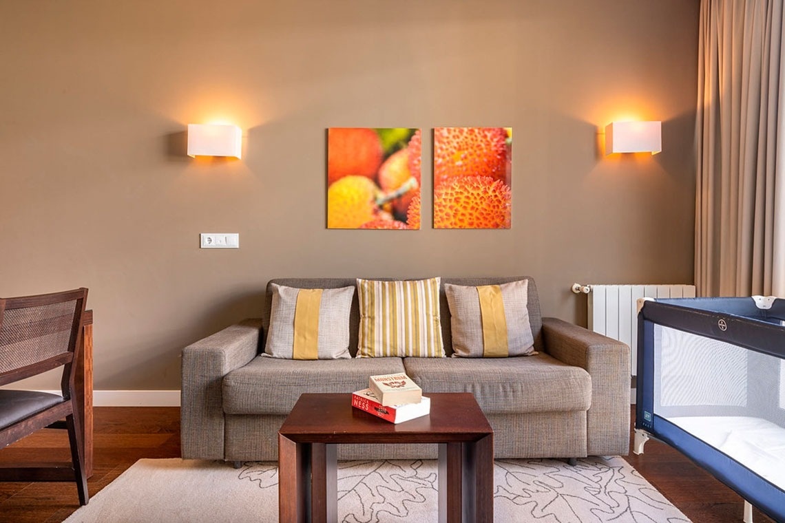 With 60 m², this is the hotel's most exclusive suite, located on the top floor, with a large private terrace, dining table and sun loungers. The spacious living room and bedroom with king-size bed ensure total comfort. It stands out for its superior luxury, including a Nespresso machine, two bathrooms and premium amenities. Equipped with a full kitchenette, LCD TV, air conditioning, bathrobe and slippers.