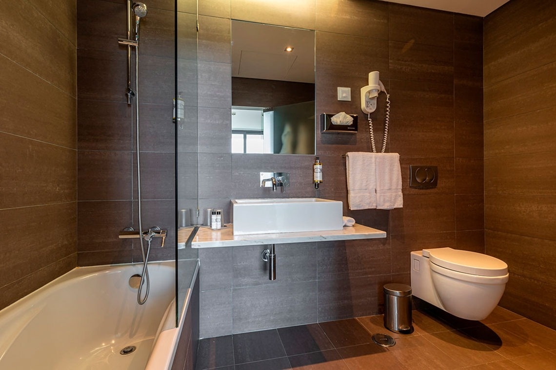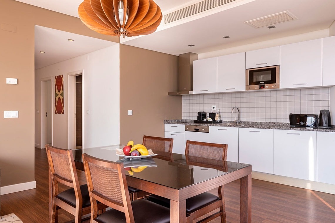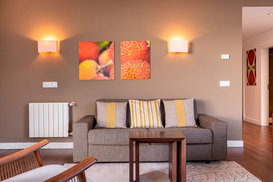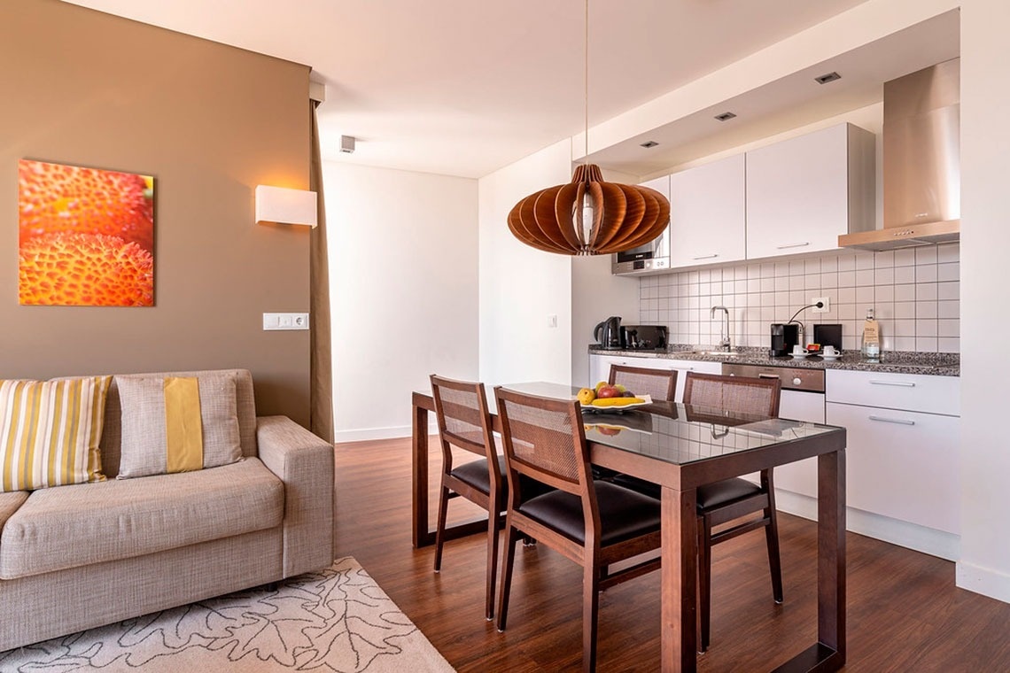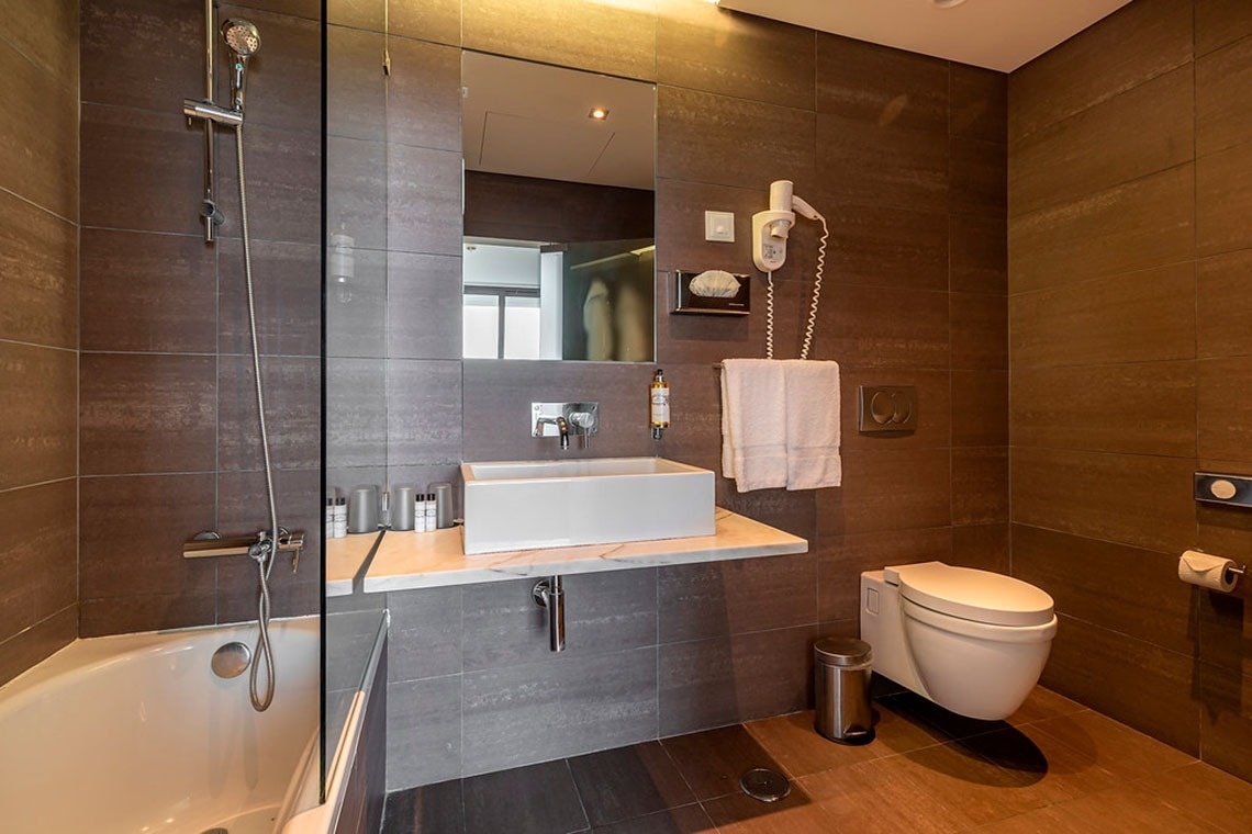 With 60 m², this is the hotel's most exclusive suite, located on the top floor, with a large private terrace, dining table and sun loungers. The spacious living room and bedroom with king-size bed ensure total comfort. It stands out for its superior luxury, including a Nespresso machine, two bathrooms and premium amenities. Equipped with a full kitchenette, LCD TV, air conditioning, bathrobe and slippers.