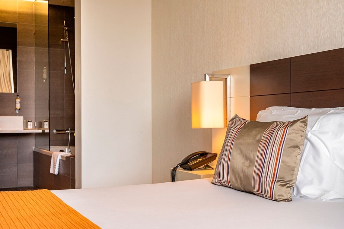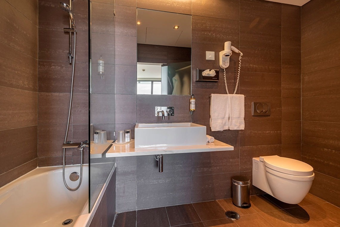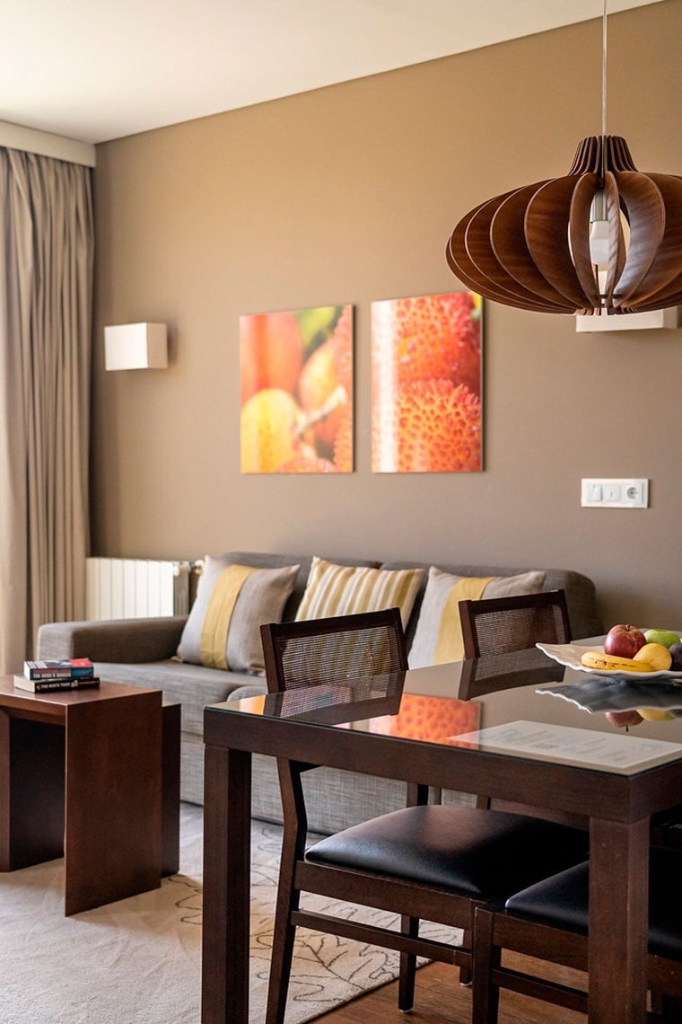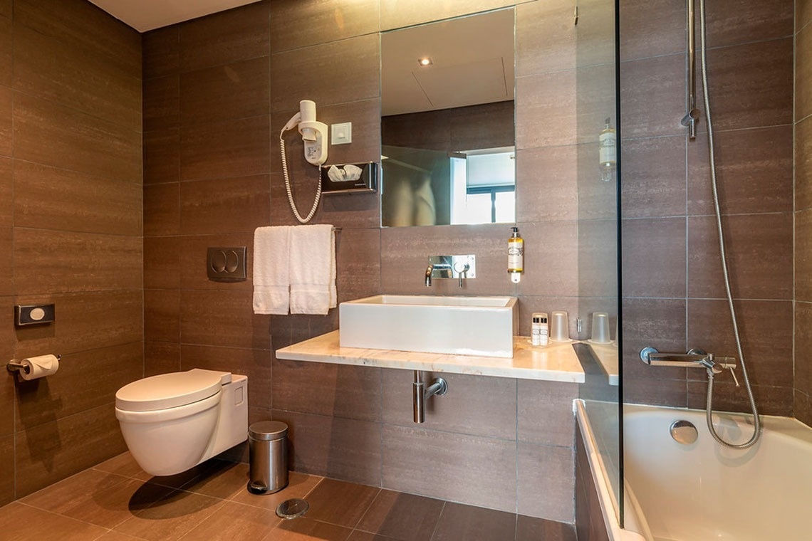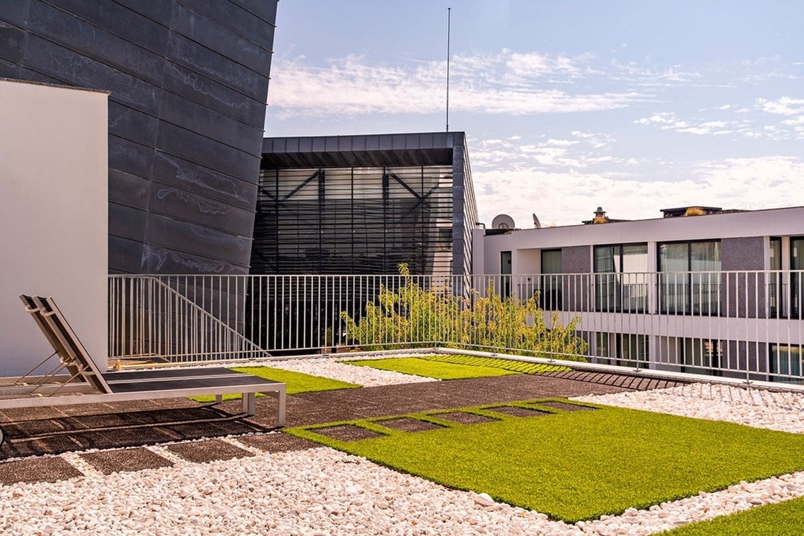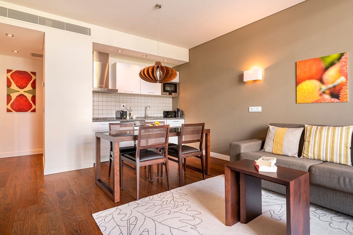 With 60 m², this is the hotel's most exclusive suite, located on the top floor, with a large private terrace, dining table and sun loungers. The spacious living room and bedroom with king-size bed ensure total comfort. It stands out for its superior luxury, including a Nespresso machine, two bathrooms and premium amenities. Equipped with a full kitchenette, LCD TV, air conditioning, bathrobe and slippers.